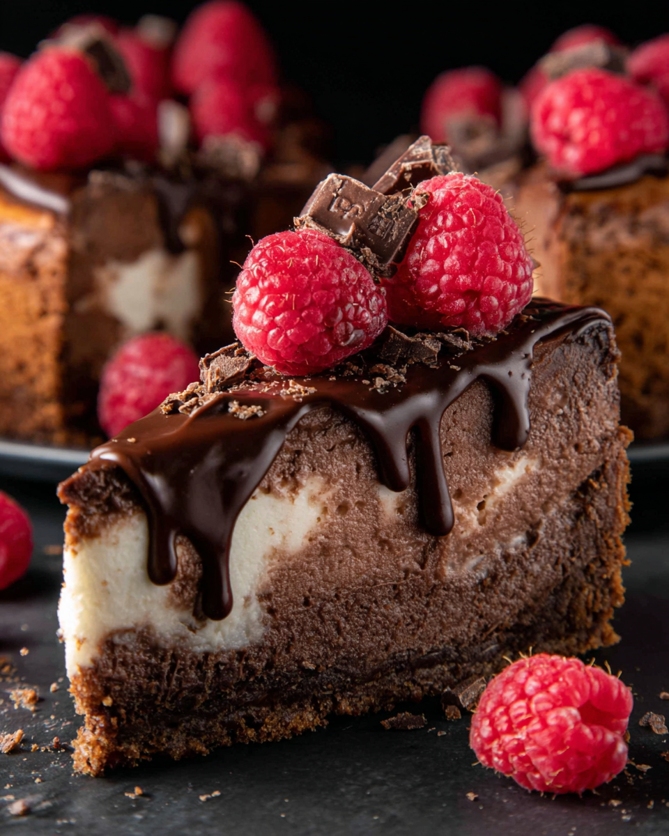The combination of dark chocolate with the tangy raspberry complements each other beautifully, resulting in a decadent dessert that offers a perfect balance of sweet and tart. This cheesecake is particularly beloved for its creamy texture and the rich layers of flavor, making it a standout choice for events or simply a treat at home.