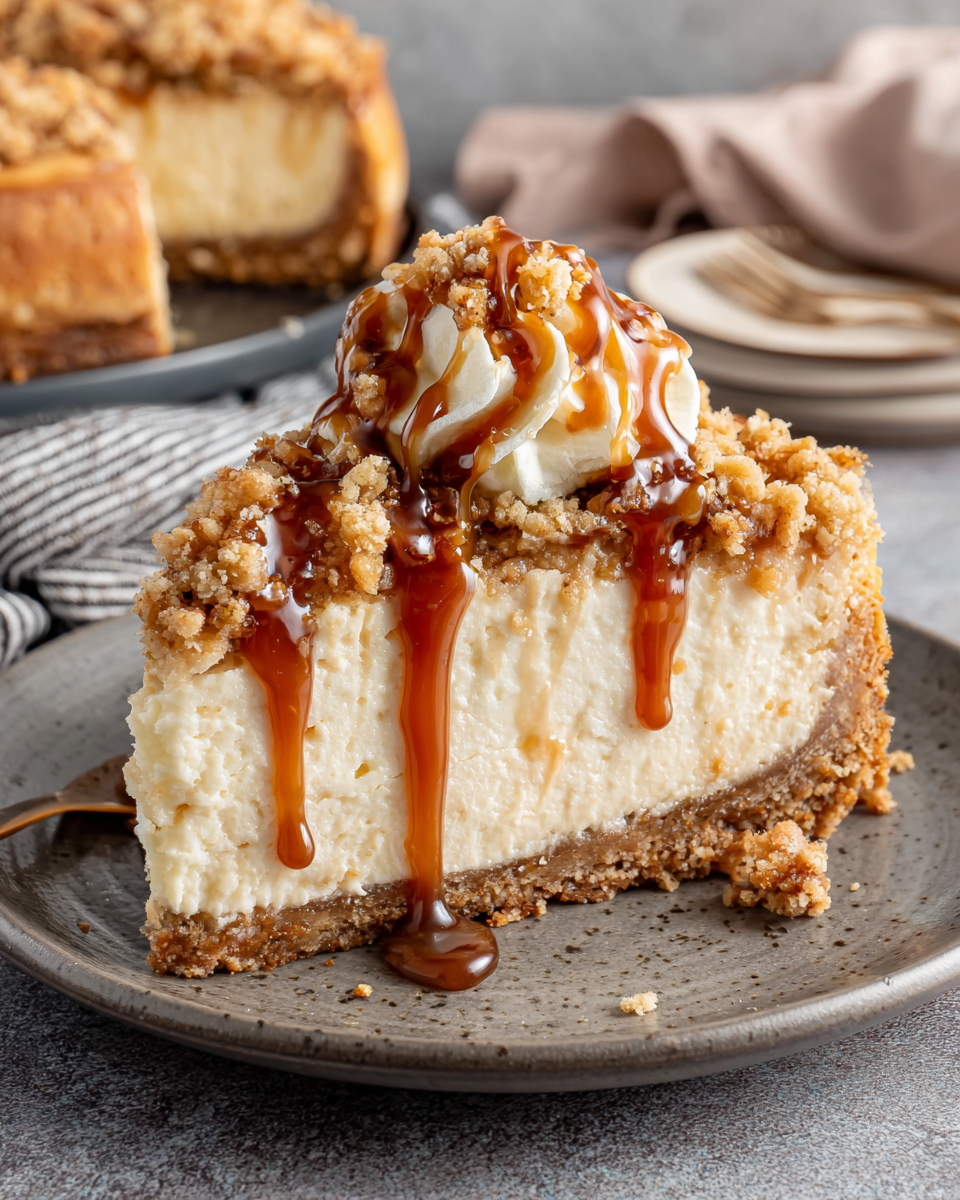Serving this cheesecake with whipped cream or caramel enhances its indulgence, allowing guests to experience a delightful blend of textures and flavors. Each slice promises rich creaminess, sweet apples, and crunch in every bite.