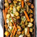 Roast in the oven for 35–45 minutes, flipping everything halfway through. You’ll know they’re ready when the edges are browned and the vegetables are fork-tender.