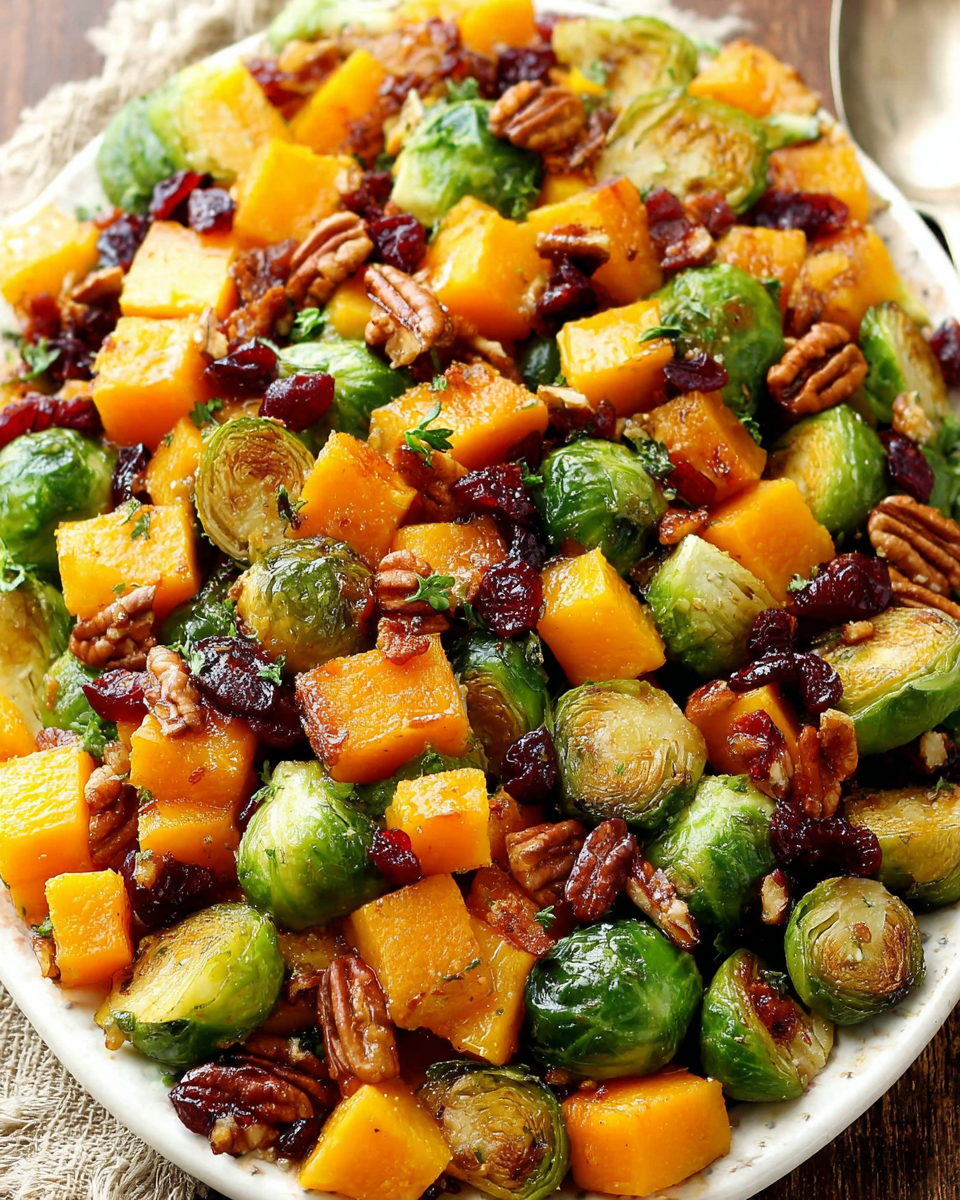 The golden-hued butternut squash provides a creamy texture and natural sweetness, while the Brussels sprouts add a delightful crunch and slight bitterness, balancing the flavors beautifully. Toss in some toasted pecans for a nutty richness and dried cranberries for a pop of tartness, and you've got a winning dish that’s both tasty and visually stunning.